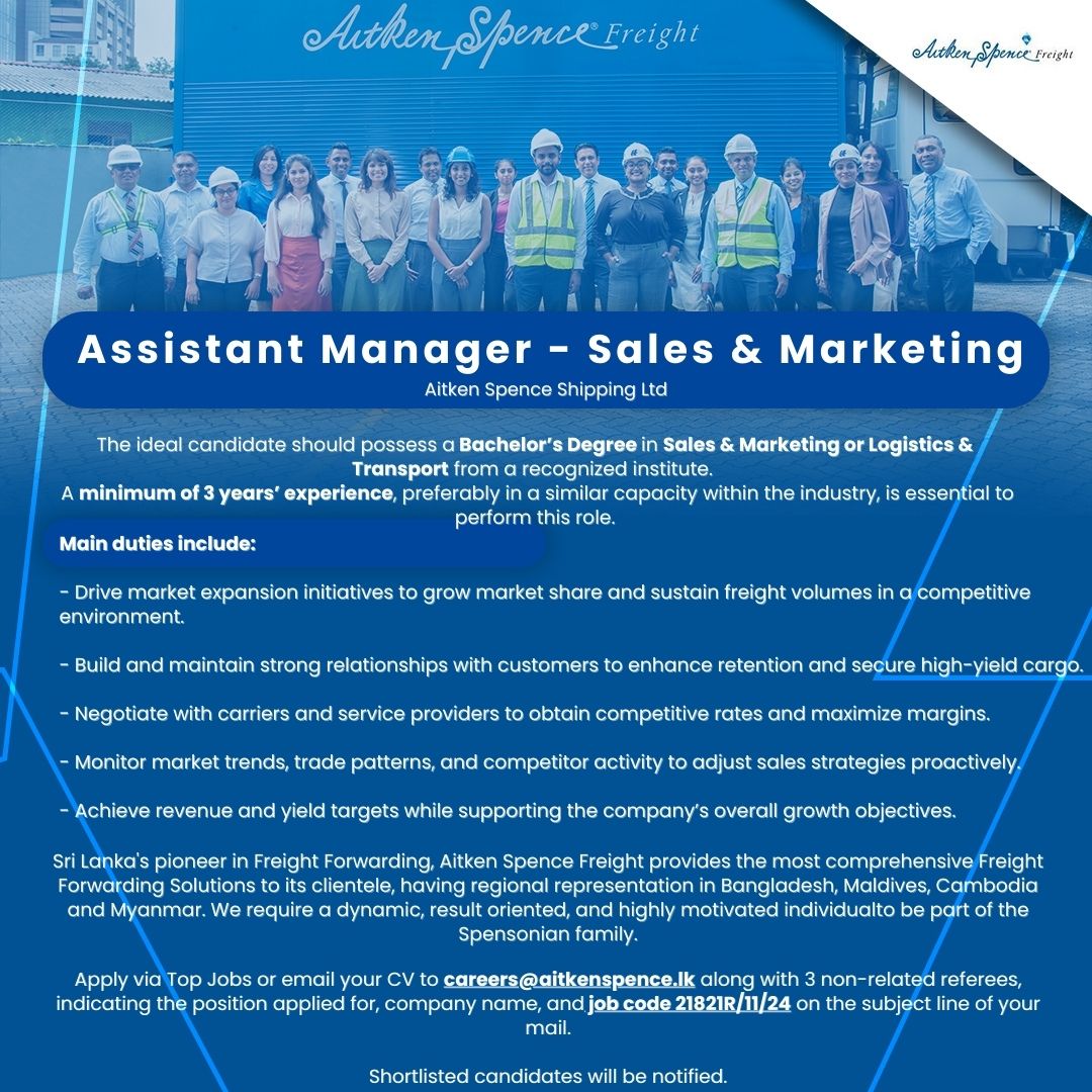 Colombo Posted 3 weeks ago Aitken Spence Shipping Ltd Full name Email address Message Upload CV (optional) Upload your CV/resume or any other relevant file. Max. file size: 512 MB.